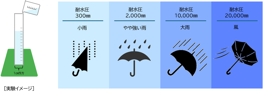 耐水圧は「濡れにくさ」の基準となる数値で、生地にしみ込もうとする水の力を抑える性能のことです。