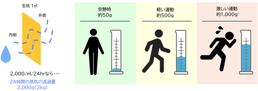 生地1㎡あたりで24時間で何gの水分を透過した(外に出した)かを評価します。